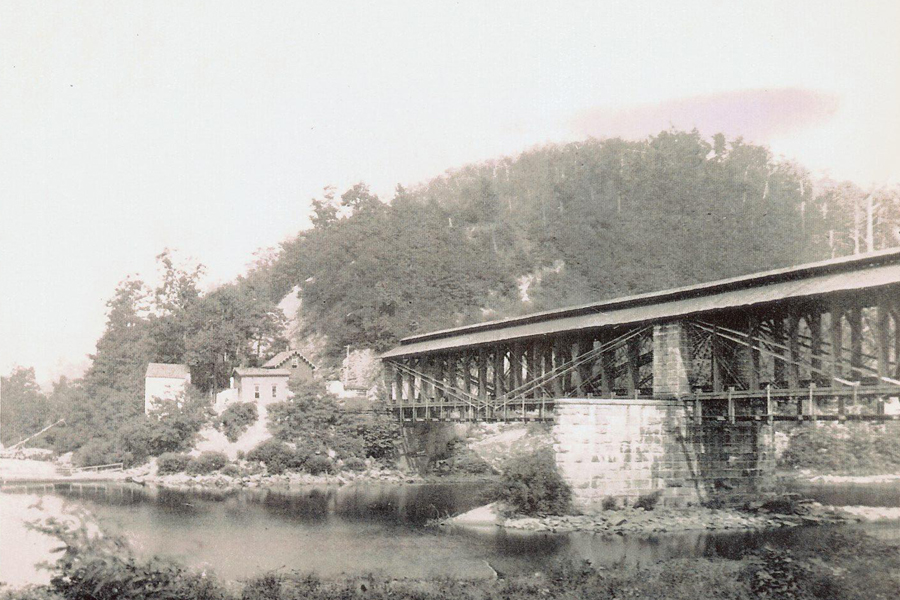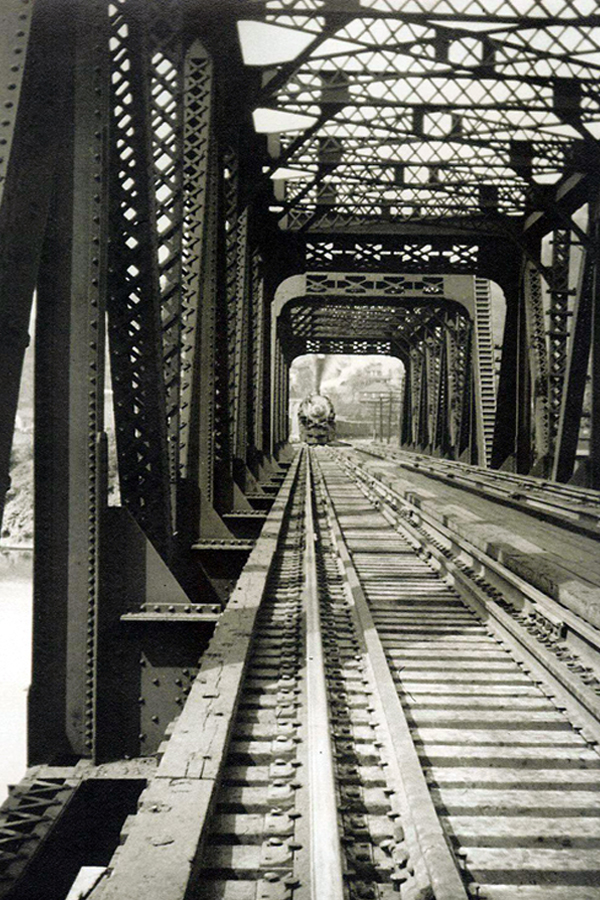 The original bridge across Cheat River was built in 1852. It has been replaced several times with steel bridges, first a single track and then double. After the flood of 1985 the bridge was converted back to a single. Here we see a photo (courtesy of the B&O Museum) of the bridge as a single track, appearing much as it did to General Hill on the previous page. This picture was taken in 1870, a few years after the Civil War. In the second photograph a steam engine approaches from the east end of the double track steel bridge. This bridge was washed out in the flood of 1985 and carried down river a half mile ramming and destroying a concrete bridge that carried traffic to Manheim. |