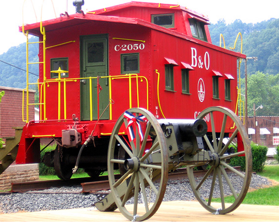 Vintage 1926 B&O caboose stands proudly next to the CSX mainline in Rowlesburg. Stenciled by Dwight Jones, the caboose is part of the Depot Museum, along with the Civil War howitzer still there to protect the railroad. Click on photo for more of Dwight's work. |