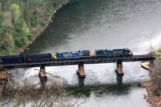 Coal train crossing Cheat River bridge. Photo taken from top of Cannon Hill. (courtesy of Tom Boylan) |